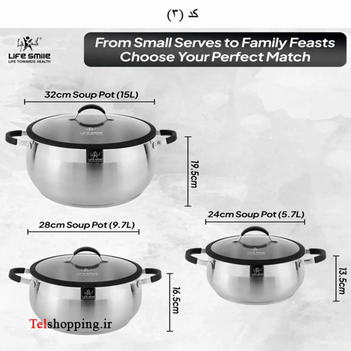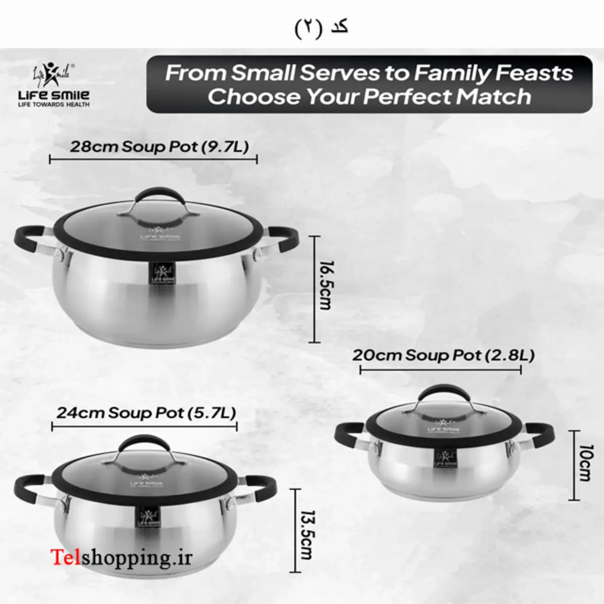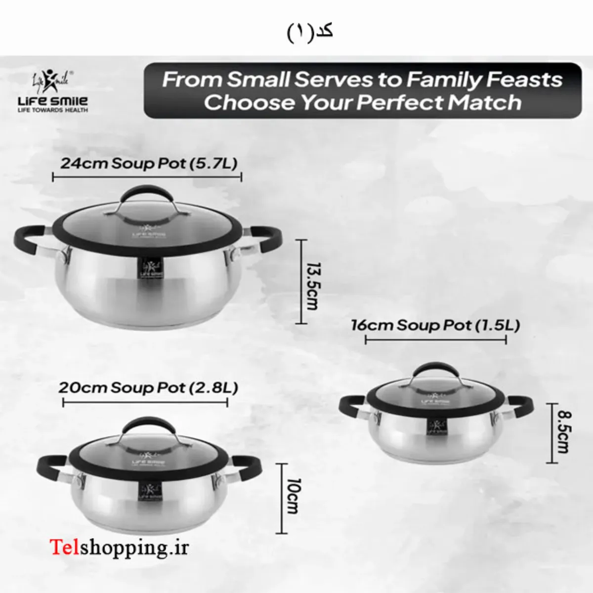 - مجموعه 1 شامل: 16 سانتیمتر (1.5 لیتر)، 20 سانتیمتر (2.8 لیتر)، 24 سانتیمتر (5.7 لیتر)