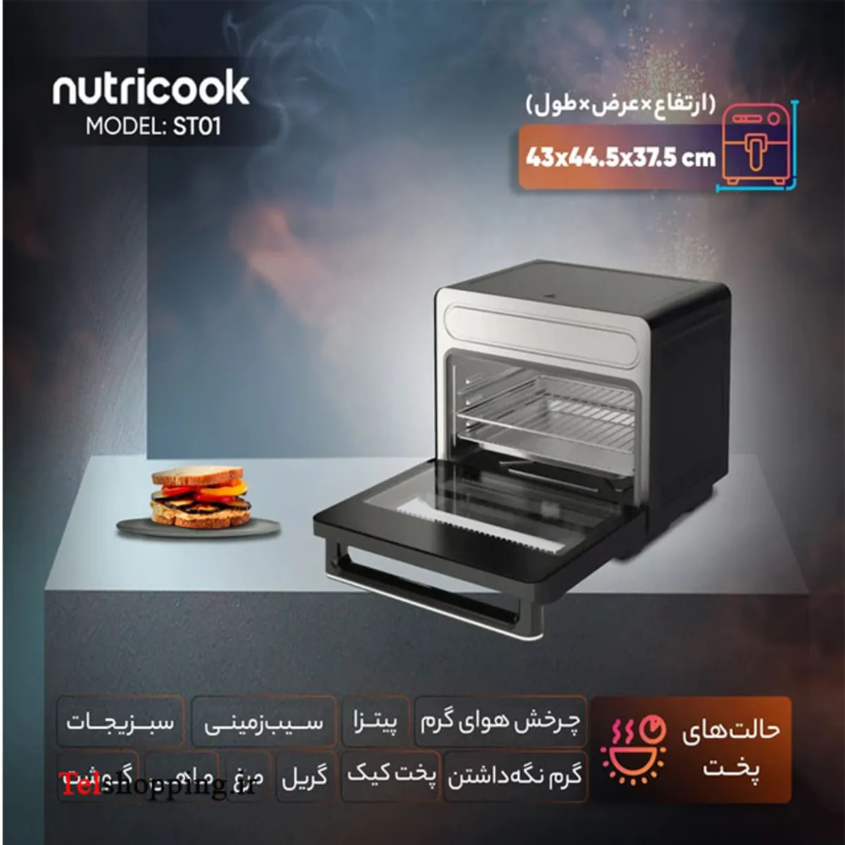 - حالتهای پخت گریل-پخت کیک-پیتزا-گرم نگه داشتن-چرخش هوای گرم-ماهی-مرغ-سیبزمینی-گوشت-سبزیجات