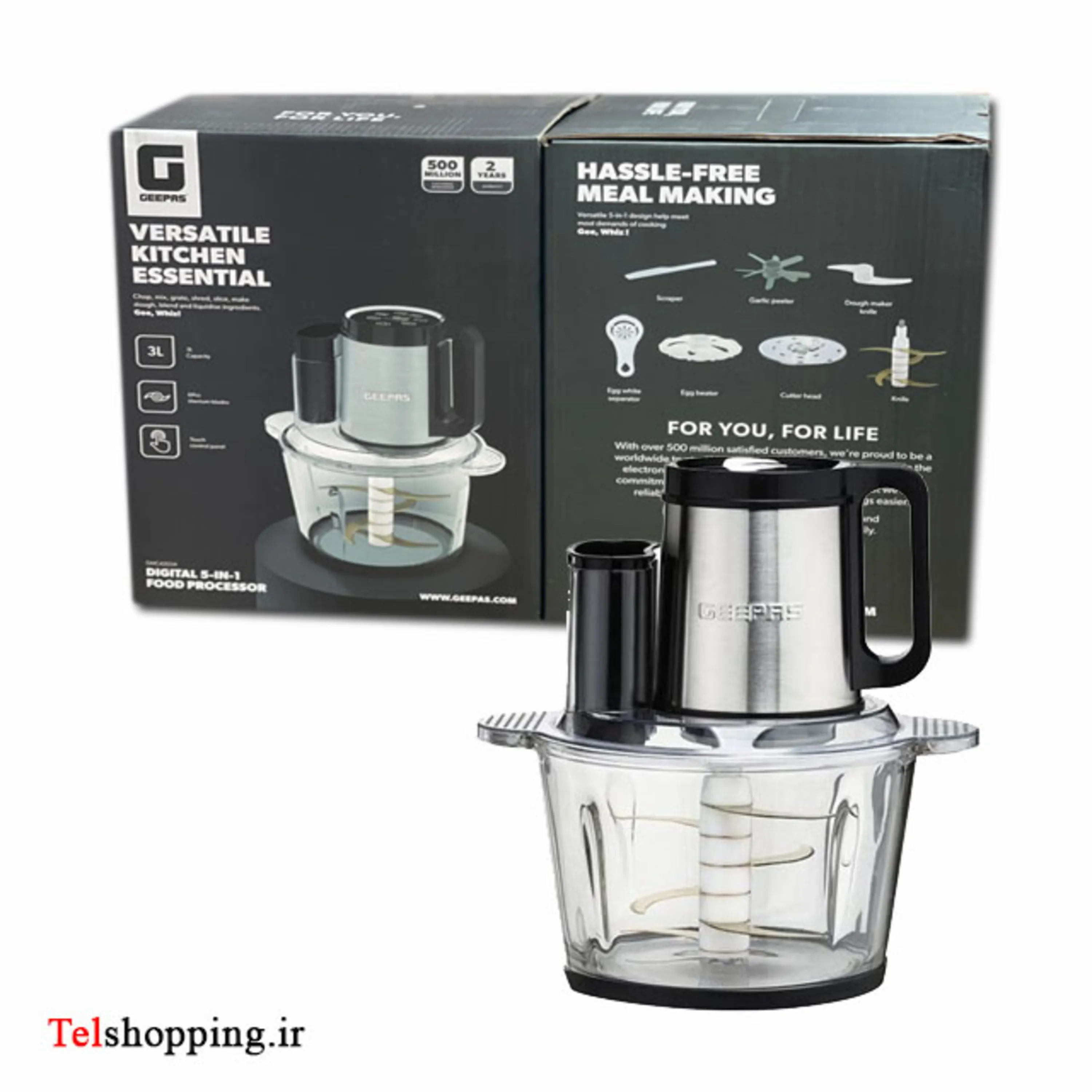 - نکات برجسته طراحی 5 کاره غذاساز چند منظوره با چندین قطعه جانبی: همزن تخممرغ، سر برش، پوستکن سیر، چاقوی خمیرزن، جداکننده سفیده تخممرغ و خراشنده. ظرفیت 3 لیتری ایدهآل برای تهیه مقادیر زیاد، مناسب برای وعدههای غذایی خانوادگی