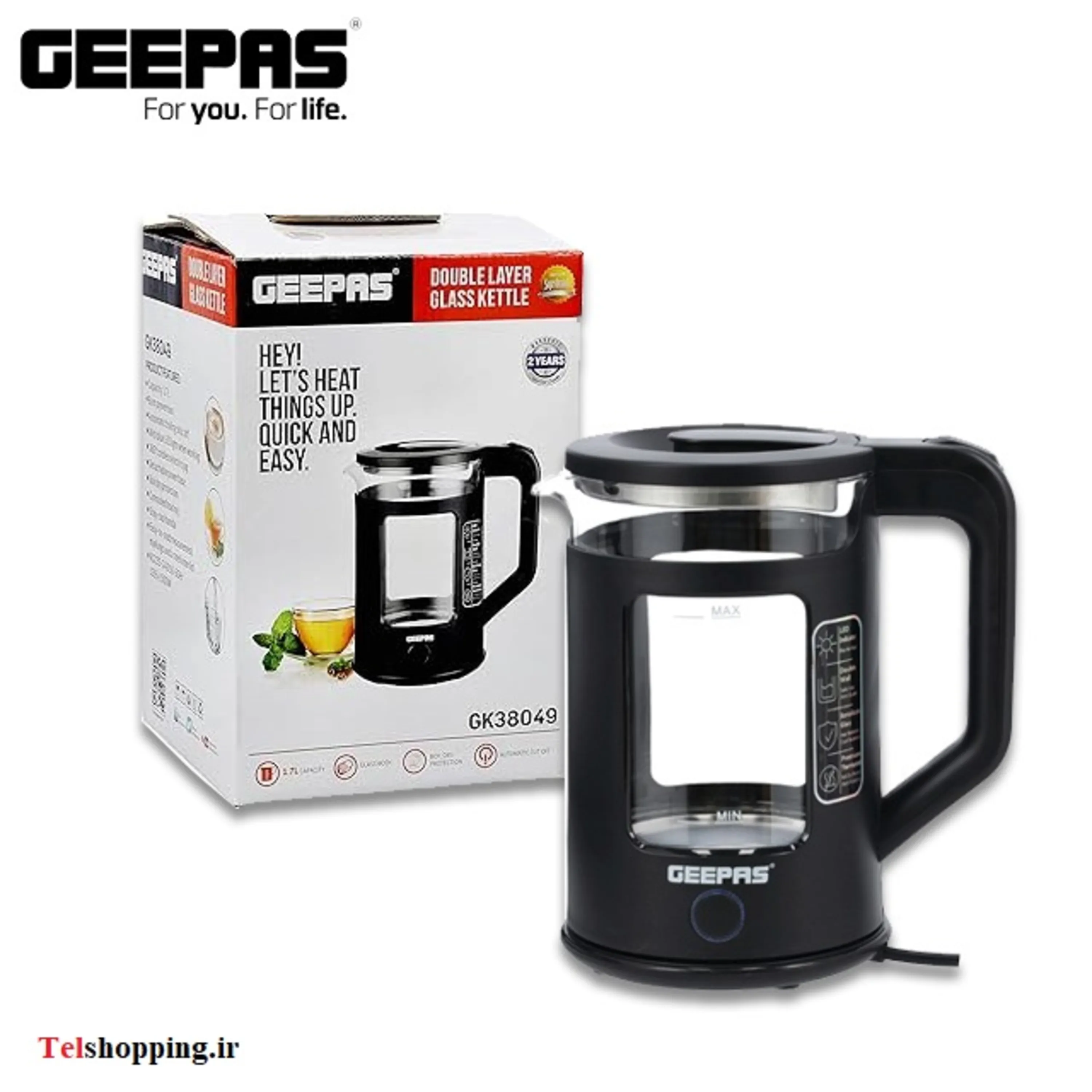 کتری برقی جیپاس ساخته شده با بدنه شیشه ای بوروسیلیکات و تکمیل شده با درب داخلی فولاد ضد زنگ، این کتری برای مقاومت در برابر هرگونه ریزش جزئی و در عین حال حفظ طعم طبیعی و جلوگیری از آلودگی طعم ساخته شده است. مجهز به چراغ های LED روشن برای نشان دادن زمان گرم شدن کتری. در حداکثر ظرفیت ( 1.7 لیتر)، آب در عرض 5 تا 6 دقیقه به جوش میآید (حباب و بخار زیاد) و آماده استفاده برای چای، بلغور جو دوسر، قهوه، ماکارونی و غیره خواهد بود. مکانیسم خاموش شدن خودکار ظرف 30 دقیقه فعال میشود. چند ثانیه پس از جوشاندن کامل آب. فناوری شارژی امکان ریختن بدون دردسر را فراهم می کند. همچنین با بدنه شیشه ای چرخشی 360 ساخته شده است. ساخته شده با دستگیره ضد لغزش و دسته مقاوم در برابر حرارت، دیگر نگران سر خوردن این کتری نخواهید بود.