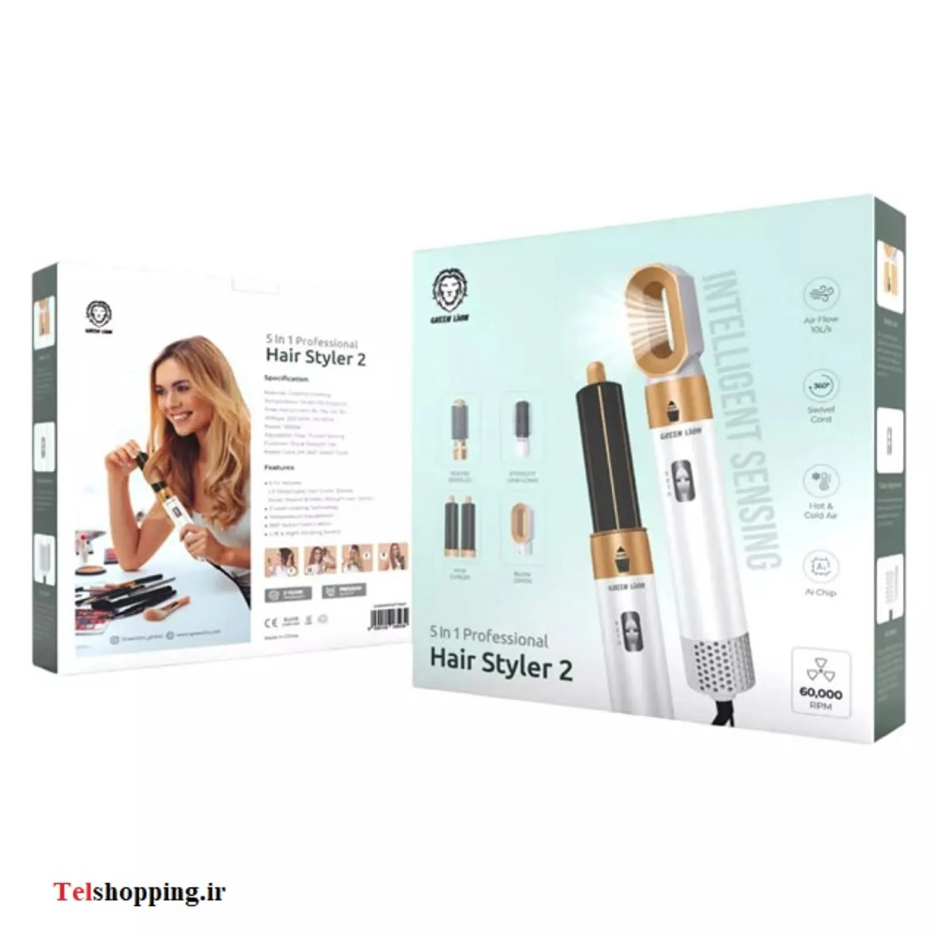 دستگاه استایلر مو 5 در 1 گرین لاین Green Lion 5 in 1 Professional Hair Styler 2 با کد فنی GN5N1PHSTYWH دارای پنج ضمیمه برس قابل تعویض است که باعث صاف کردن، فر کردن، ترکیب سشوار با برس های حالت دهنده می شود، می تواند برای طول های مختلف مو مناسب باشد و سبک های مختلفی ایجاد کند. صاف کننده هوای گرم ما دارای فناوری پیشرفته یون منفی و روکش سرامیکی است که از موخوره و الکتریسیته ساکن جلوگیری می کند. این برس سشوار به لطف ترکیبی از پینهای نایلونی و موهای پرزدار، گرهخوردگی و شکستگی را به حداقل میرساند و در عین حال به ماساژ راحت پوست سر کمک میکند.