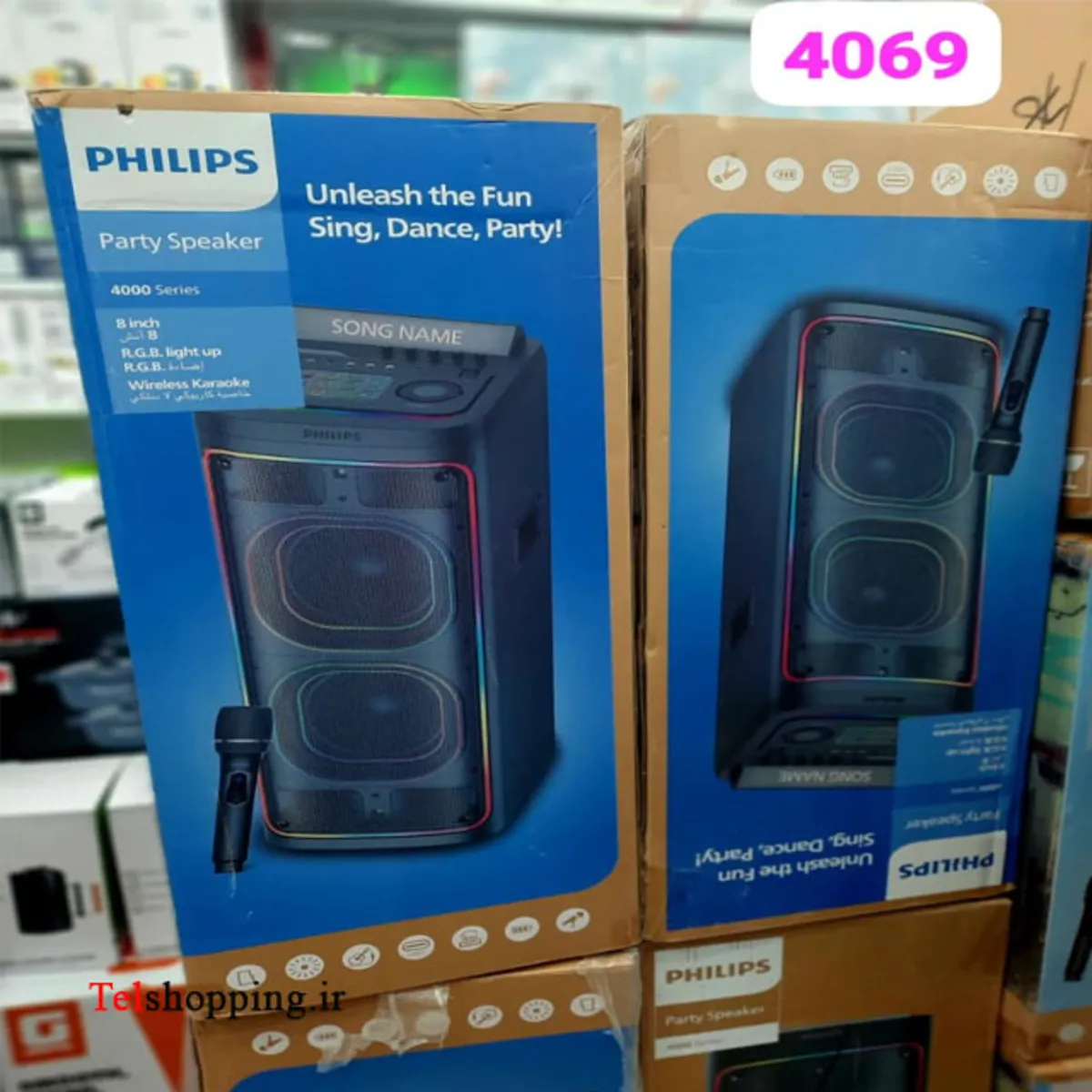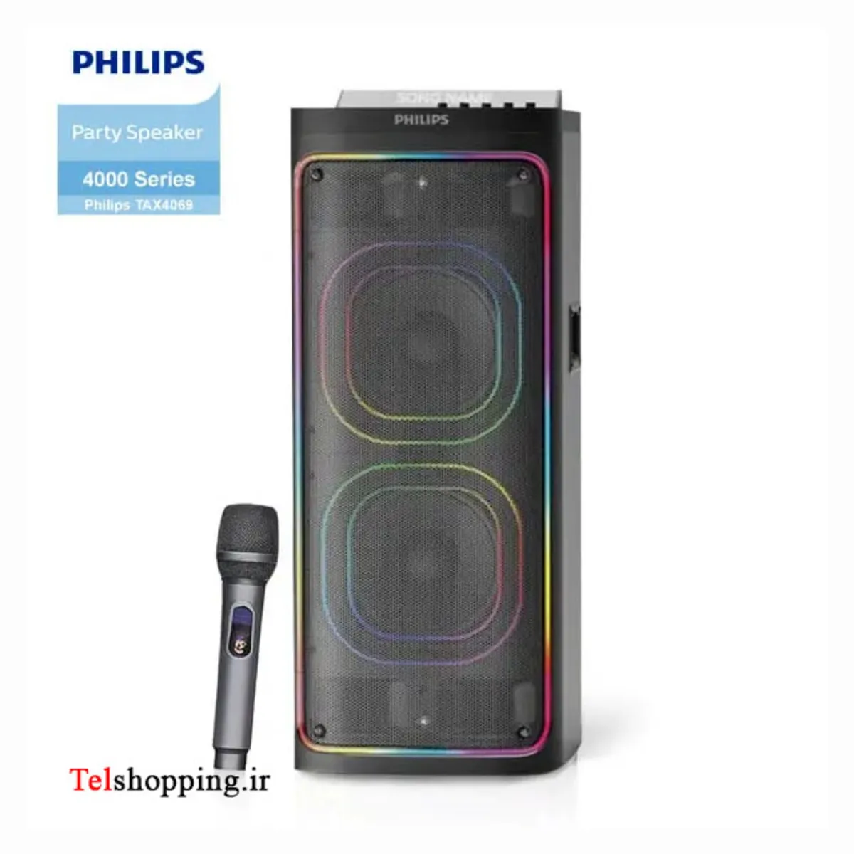 - اسپیکر PHILIPS TAX 4069 Wireless Karaoke Party Speaker یک سیستم صوتی کامل و حرفهای برای کسانی است که به دنبال صدای قوی، بیس عمیق و امکانات کامل پارتی در یک اسپیکر قابلحمل هستند. این مدل با دو اسپیکر 8 اینچی قدرتمند و توان خروجی 75 وات صدایی شفاف، پرحجم و کوبنده ارائه میدهد که بهراحتی فضای مهمانی را پوشش میدهد.